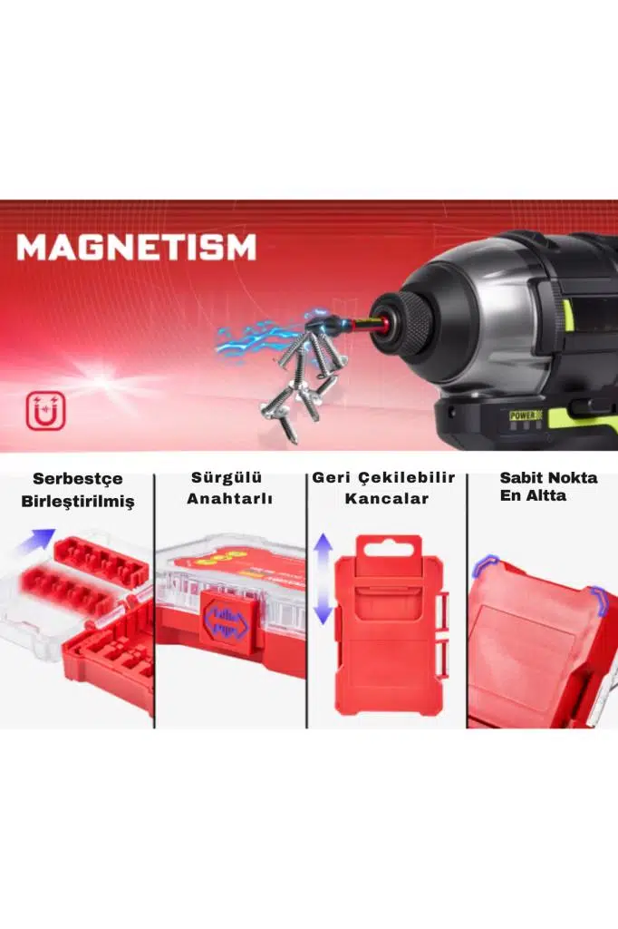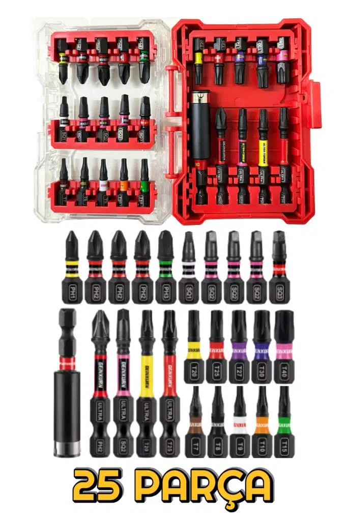 Toplam 25 parçadan oluşmakta olup içerisinde 1 adet uzatma adaptörü 24 adet de çeşitli boyutlarda ve çeşitli modellerde bits uçlar mevcuttur.