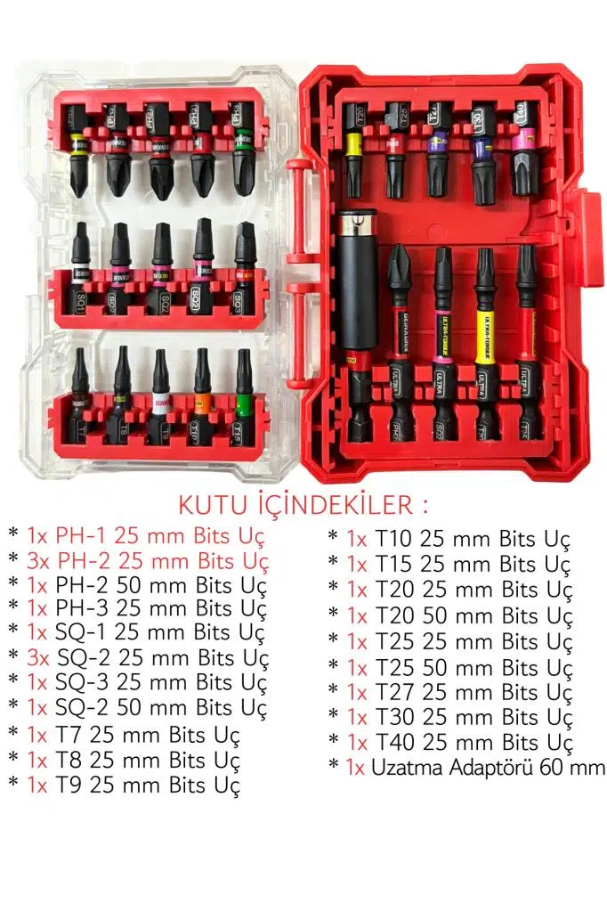 * 1x PH-1 25 mm Bits Uç, * 3x PH-2 25 mm Bits Uç, * 1x PH-2 50 mm Bits Uç, * 1x PH-3 25 mm Bits Uç, * 1x SQ-1 25 mm Bits Uç, * 3x SQ-2 25 mm Bits Uç , * 1x SQ-3 25 mm Bits Uç, * 1x SQ-2 50 mm Bits Uç, * 1x T7 25 mm Bits Uç, * 1x T8 25 mm Bits Uç, * 1x T9 25 mm Bits Uç, * 1x T10 25 mm Bits Uç, * 1x T15 25 mm Bits Uç, * 1x T20 25 mm Bits Uç, * 1x T20 50 mm Bits Uç, * 1x T25 25 mm Bits Uç, * 1x T25 50 mm Bits Uç, * 1x T27 25 mm Bits Uç, * 1x T30 25 mm Bits Uç, * 1x T40 25 mm Bits Uç, * 1x Uzatma Adaptörü 60 mm