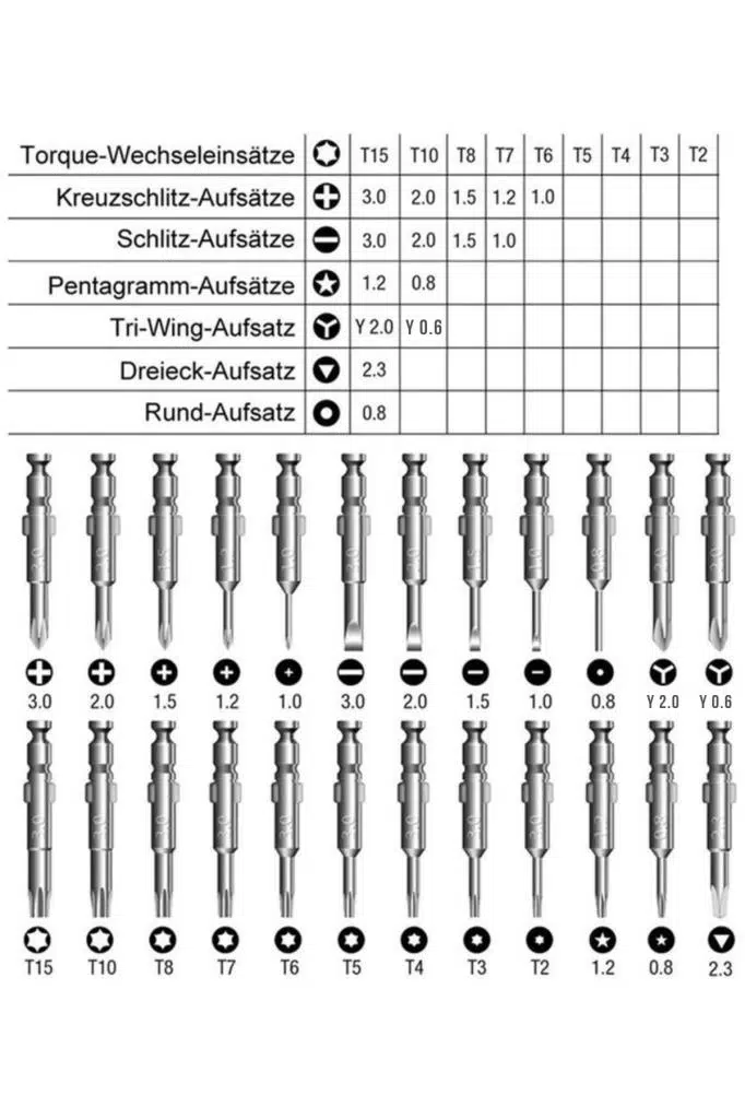 -Altıgen tornavida (9 adet): T2, T3, T4, T5, T6, T7, T8, T10, T15