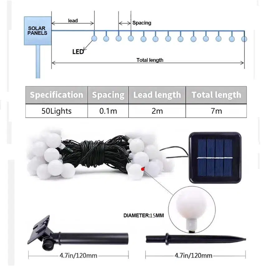 Güneş Enerjili 50 LED 7 Metre Dış Mekan Kamp Bahçe Ağaç Led Işık 8 Modlu Parti Malzemeleri