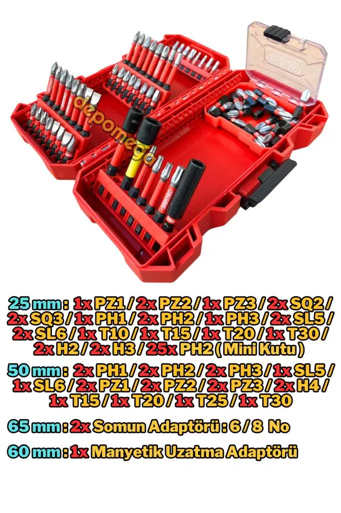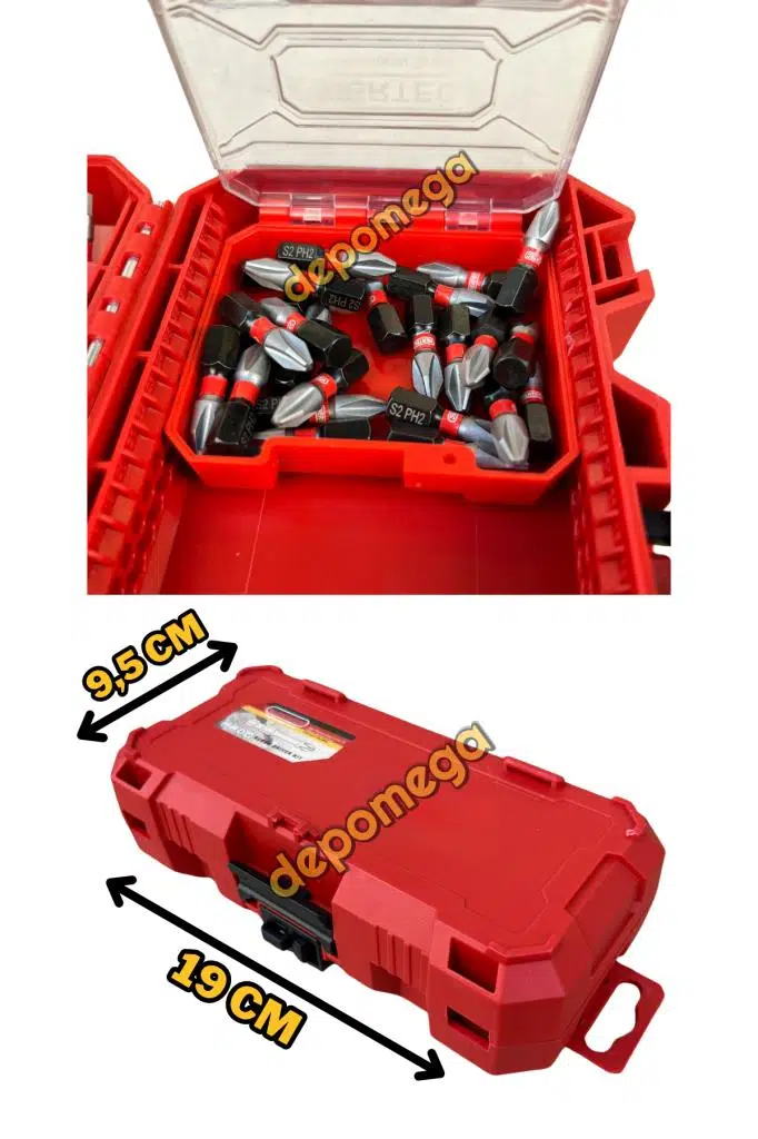 25 mm :1x PZ1 / 2x PZ2 / 1x PZ3 / 2x SQ2 / 2x SQ3 / 1x PH1 / 2x PH2 / 1x PH3 / 2x SL5 / 2x SL6 / 1x T10 / 1x T15 / 1x T20 / 1x T30 / 2x H2 / 2x H3 / 25x PH2 ( Mini Kutu )