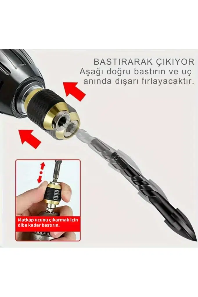 Ancak bu ürün sayesinde sadece matkabınıza takıp istediğiniz ucu değiştirirken adaptörü iki parmağınızla geriye çekmeniz yeterli hemen ağzındaki ucu atacak ve diğer ucu hızlıca takıp işinize devam edebileceksiniz.